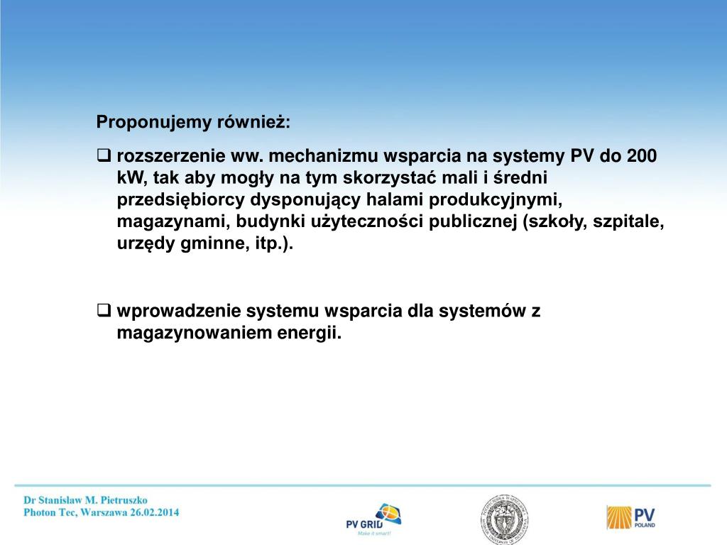 Proponujemy również: • rozszerzenie ww. mechanizmu wsparcia na systemy PV do 200 kW, tak aby mogły na tym skorzystać mali i średni przedsiębiorcy dysponujący halami produkcyjnymi, magazynami, budynki użyteczności publicznej (szkoły, szpitale, urzędy gminne, itp.). • wprowadzenie systemu wsparcia dla systemów z magazynowaniem energii.