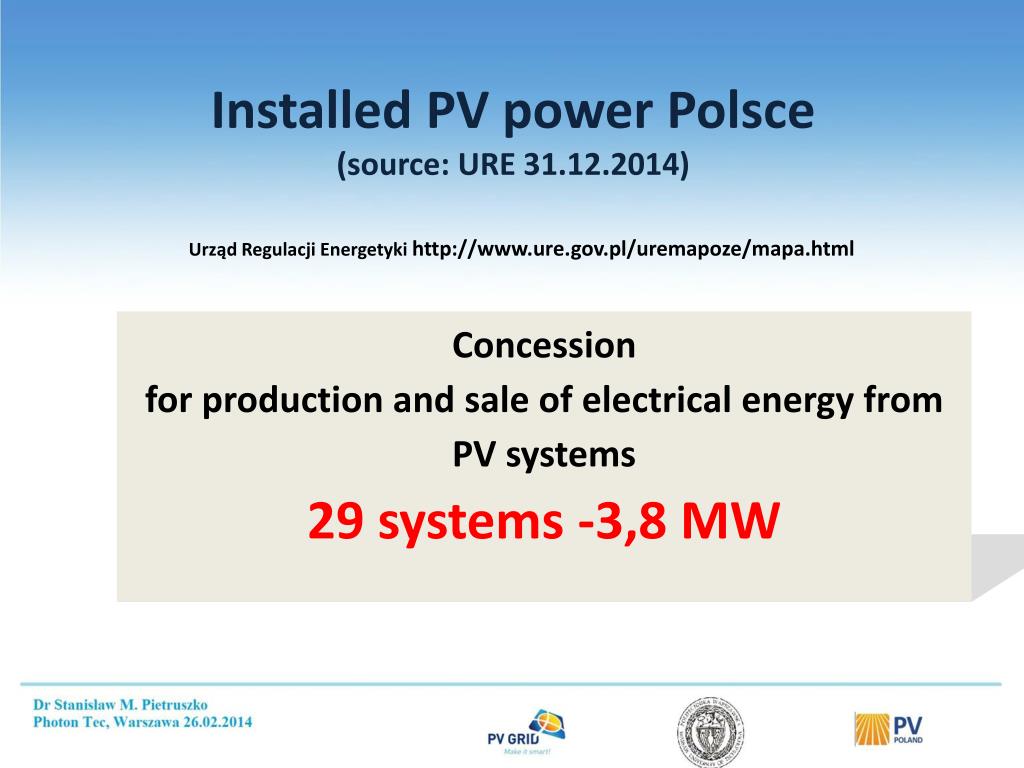 Installed PV power Polsce (source: URE 31.12.2014)Urząd Regulacji Energetyki http://www.ure.gov.pl/uremapoze/mapa.html Concessionfor production and sale of electricalenergyfrom PV systems 29 systems -3,8 MW