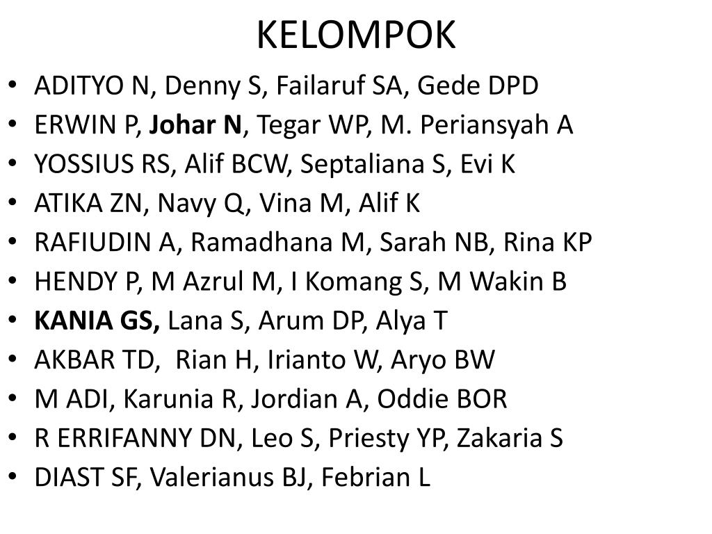 KELOMPOK • ADITYO N, Denny S, Failaruf SA, Gede DPD • ERWIN P, Johar N, Tegar WP, M. Periansyah A • YOSSIUS RS, Alif BCW, Septaliana S, Evi K • ATIKA ZN, Navy Q, Vina M, Alif K • RAFIUDIN A, Ramadhana M, Sarah NB, Rina KP • HENDY P, M Azrul M, I Komang S, M Wakin B • KANIA GS, Lana S, Arum DP, Alya T • AKBAR TD, Rian H, Irianto W, Aryo BW • M ADI, Karunia R, Jordian A, Oddie BOR • R ERRIFANNY DN, Leo S, Priesty YP, Zakaria S • DIAST SF, Valerianus BJ, Febrian L