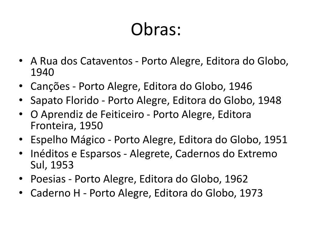 Obras: • A Rua dos Cataventos - Porto Alegre, Editora do Globo, 1940 • Canções - Porto Alegre, Editora do Globo, 1946 • Sapato Florido - Porto Alegre, Editora do Globo, 1948 • O Aprendiz de Feiticeiro - Porto Alegre, Editora Fronteira, 1950 • Espelho Mágico - Porto Alegre, Editora do Globo, 1951 • Inéditos e Esparsos - Alegrete, Cadernos do Extremo Sul, 1953 • Poesias - Porto Alegre, Editora do Globo, 1962 • Caderno H - Porto Alegre, Editora do Globo, 1973
