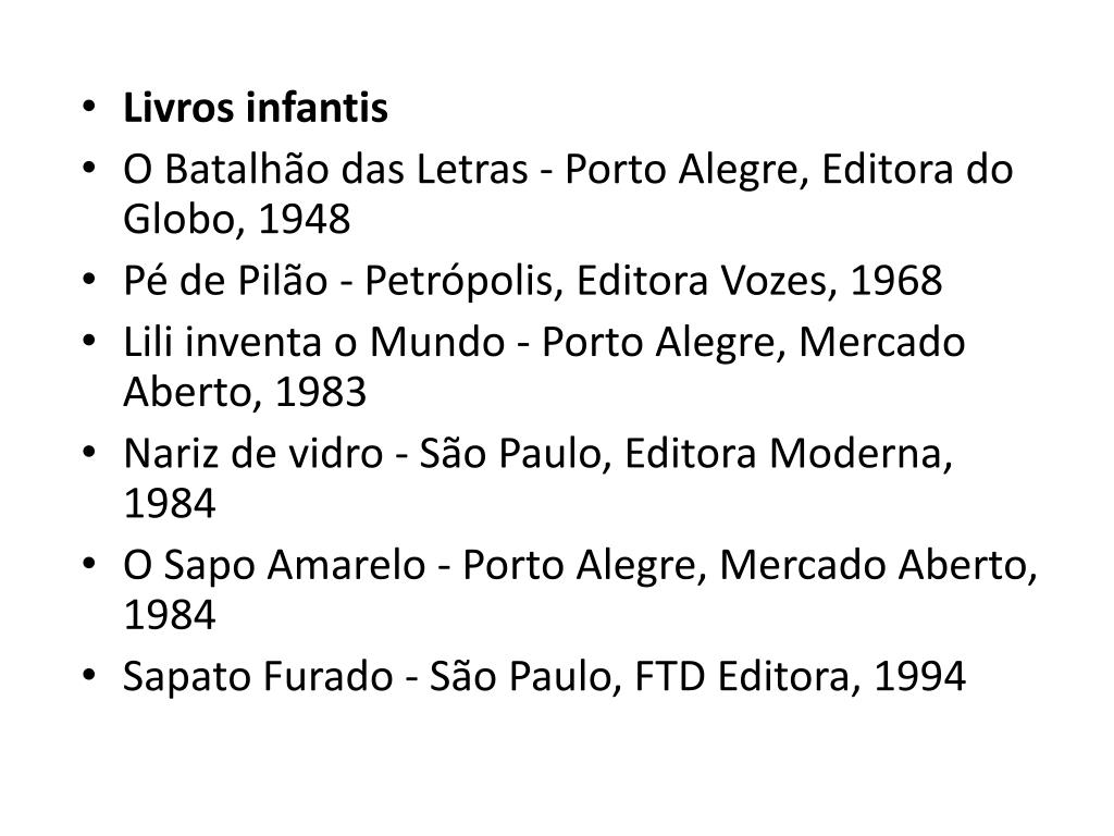 Livros infantis • O Batalhão das Letras - Porto Alegre, Editora do Globo, 1948 • Pé de Pilão - Petrópolis, Editora Vozes, 1968 • Lili inventa o Mundo - Porto Alegre, Mercado Aberto, 1983 • Nariz de vidro - São Paulo, Editora Moderna, 1984 • O Sapo Amarelo - Porto Alegre, Mercado Aberto, 1984 • Sapato Furado - São Paulo, FTD Editora, 1994
