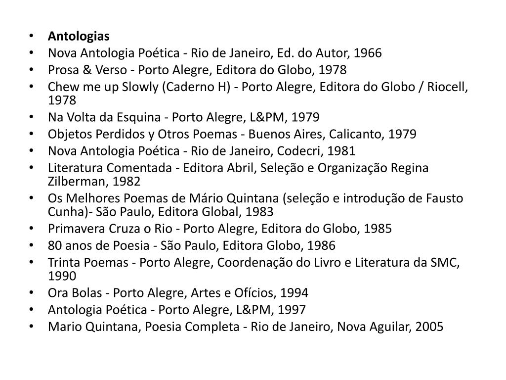 Antologias • Nova Antologia Poética - Rio de Janeiro, Ed. do Autor, 1966 • Prosa & Verso - Porto Alegre, Editora do Globo, 1978 • Chew me up Slowly (Caderno H) - Porto Alegre, Editora do Globo / Riocell, 1978 • Na Volta da Esquina - Porto Alegre, L&PM, 1979 • Objetos Perdidos y Otros Poemas - Buenos Aires, Calicanto, 1979 • Nova Antologia Poética - Rio de Janeiro, Codecri, 1981 • Literatura Comentada - Editora Abril, Seleção e Organização Regina Zilberman, 1982 • Os Melhores Poemas de Mário Quintana (seleção e introdução de Fausto Cunha)- São Paulo, Editora Global, 1983 • Primavera Cruza o Rio - Porto Alegre, Editora do Globo, 1985 • 80 anos de Poesia - São Paulo, Editora Globo, 1986 • Trinta Poemas - Porto Alegre, Coordenação do Livro e Literatura da SMC, 1990 • Ora Bolas - Porto Alegre, Artes e Ofícios, 1994 • Antologia Poética - Porto Alegre, L&PM, 1997 • Mario Quintana, Poesia Completa - Rio de Janeiro, Nova Aguilar, 2005