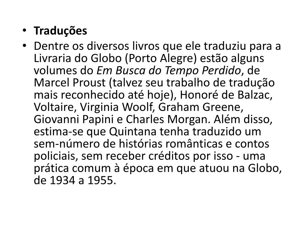 Traduções • Dentre os diversos livros que ele traduziu para a Livraria do Globo (Porto Alegre) estão alguns volumes do Em Busca do Tempo Perdido, de Marcel Proust (talvez seu trabalho de tradução mais reconhecido até hoje), Honoré de Balzac, Voltaire, Virginia Woolf, Graham Greene, Giovanni Papini e Charles Morgan. Além disso, estima-se que Quintana tenha traduzido um sem-número de histórias românticas e contos policiais, sem receber créditos por isso - uma prática comum à época em que atuou na Globo, de 1934 a 1955.