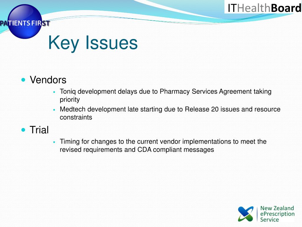 Key Issues • Vendors • Toniq development delays due to Pharmacy Services Agreement taking priority • Medtech development late starting due to Release 20 issues and resource constraints • Trial • Timing for changes to the current vendor implementations to meet the revised requirements and CDA compliant messages