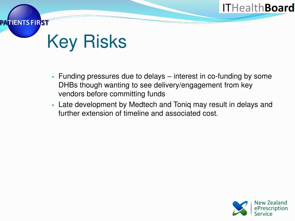 Key Risks • Funding pressures due to delays – interest in co-funding by some DHBs though wanting to see delivery/engagement from key vendors before committing funds • Late development by Medtech and Toniq may result in delays and further extension of timeline and associated cost.