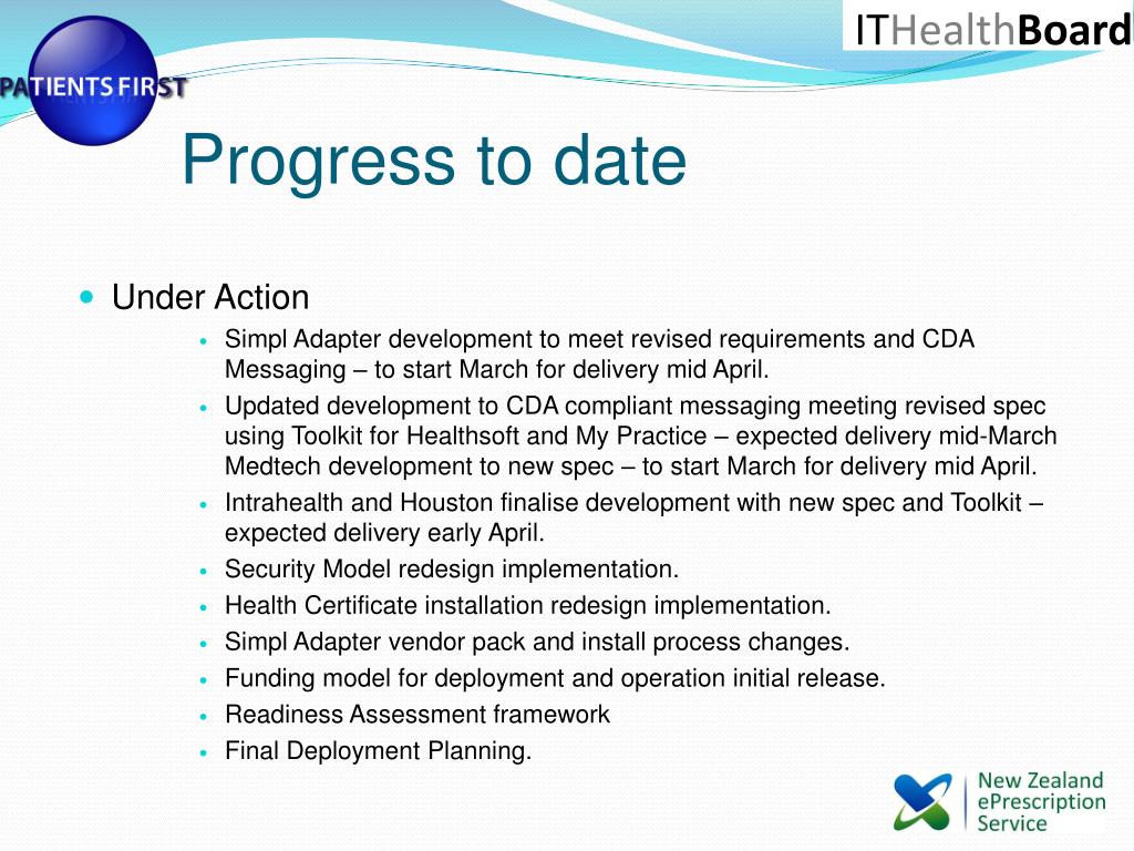 Progress to date • Under Action • Simpl Adapter development to meet revised requirements and CDA Messaging – to start March for delivery mid April. • Updated development to CDA compliant messaging meeting revised spec using Toolkit for Healthsoft and My Practice – expected delivery mid-March Medtech development to new spec – to start March for delivery mid April. • Intrahealth and Houston finalise development with new spec and Toolkit – expected delivery early April. • Security Model redesign implementation. • Health Certificate installation redesign implementation. • Simpl Adapter vendor pack and install process changes. • Funding model for deployment and operation initial release. • Readiness Assessment framework • Final Deployment Planning.