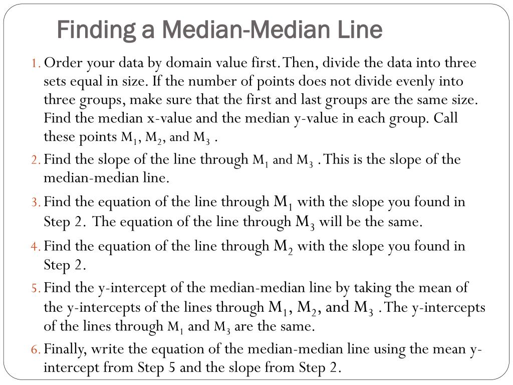 Finding a Median-Median Line • Order your data by domain value first. Then, divide the data into three sets equal in size. If the number of points does not divide evenly into three groups, make sure that the first and last groups are the same size. Find the median x-value and the median y-value in each group. Call these points M1, M2, and M3. • Find the slope of the line through M1 and M3. This is the slope of the median-median line. • Find the equation of the line through M1 with the slope you found in Step 2. The equation of the line through M3 will be the same. • Find the equation of the line through M2 with the slope you found in Step 2. • Find the y-intercept of the median-median line by taking the mean of the y-intercepts of the lines through M1, M2, and M3. The y-intercepts of the lines through M1 and M3 are the same. • Finally, write the equation of the median-median line using the mean y-intercept from Step 5 and the slope from Step 2.