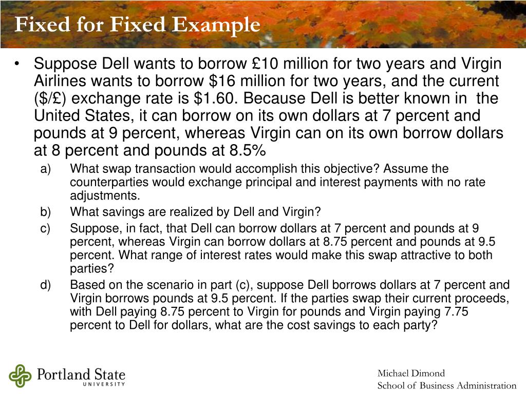 Fixed for Fixed Example • Suppose Dell wants to borrow £10 million for two years and Virgin Airlines wants to borrow $16 million for two years, and the current ($/£) exchange rate is $1.60. Because Dell is better known in the United States, it can borrow on its own dollars at 7 percent and pounds at 9 percent, whereas Virgin can on its own borrow dollars at 8 percent and pounds at 8.5% • What swap transaction would accomplish this objective? Assume the counterparties would exchange principal and interest payments with no rate adjustments. • What savings are realized by Dell and Virgin? • Suppose, in fact, that Dell can borrow dollars at 7 percent and pounds at 9 percent, whereas Virgin can borrow dollars at 8.75 percent and pounds at 9.5 percent. What range of interest rates would make this swap attractive to both parties? • Based on the scenario in part (c), suppose Dell borrows dollars at 7 percent and Virgin borrows pounds at 9.5 percent. If the parties swap their current proceeds, with Dell paying 8.75 percent to Virgin for pounds and Virgin paying 7.75 percent to Dell for dollars, what are the cost savings to each party?