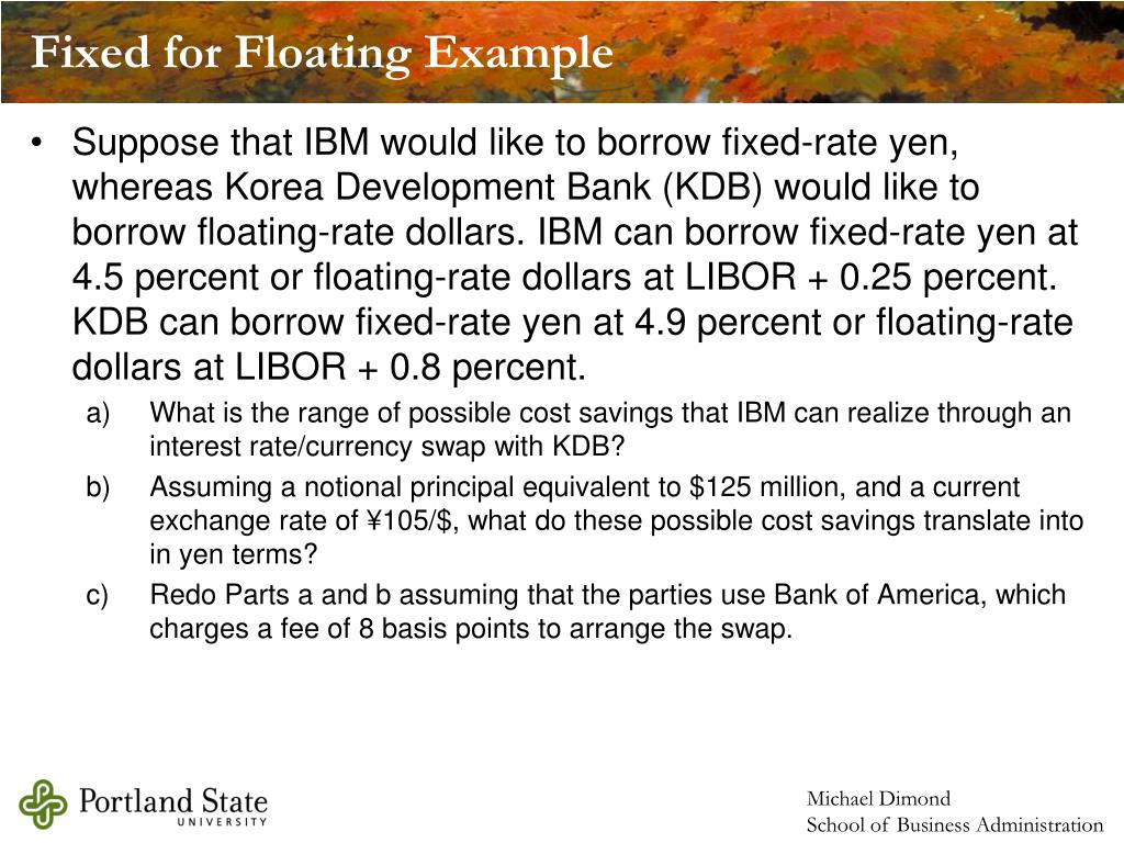 A) The cost to each party of accessing either the fixed-rate yen or the floating‑rate dollar market for a new debt issue is as follows: Given the differences in rates between the two markets, the two parties can achieve a combined 15 basis point savings through IBM borrowing floating-rate dollars at LIBOR + 0.25% and KDB borrowing fixed-rate yen at 4.9% and then swapping the proceeds. IBM would be able to borrow fixed-rate yen at 4.35% if all these savings were passed along to it in the swap. This could be accomplished by IBM providing KDB with floating-rate dollars at LIBOR + 0.25%, saving KDB 0.55%, which then passed these savings along to IBM by swapping the fixed-rate yen at 4.9% - 0.55% = 4.35%. Thus, the potential savings to IBM range from 0 to 0.15%. B) At a current exchange rate of ¥105/$, IBM's borrowing would equal ¥13,125,000,000 (125,000,000*105). A 0.15% savings on that amount would translate into ¥19,687,500 per annum (¥13,125,000,000*0.0015). C) In this case, the potential savings from a swap net out to 7 basis points. If IBM realizes all these savings, its borrowing cost would be lowered to 4.43% (4.5% - 0.07%). The 7 basis point saving would translate into an annual saving of ¥9,187,500 (¥13,125,000,000*0.0007). Fixed for Floating Answer
