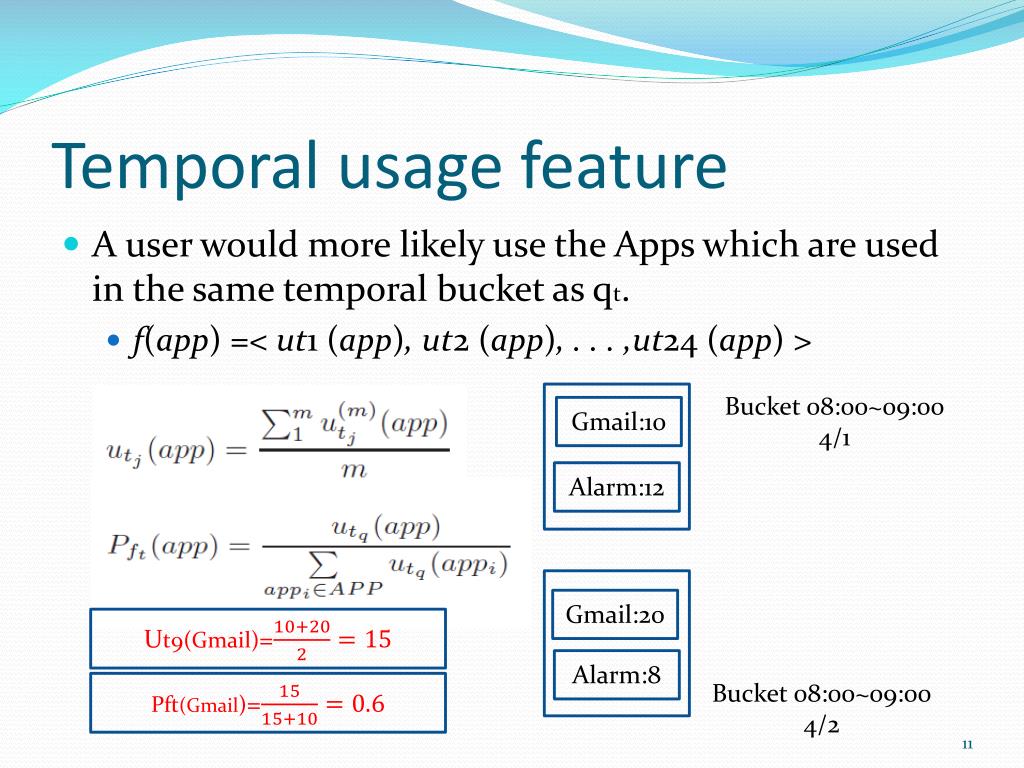 Temporal usage feature • A user would more likely use theApps which are used in the same temporal bucket as qt. • f(app) =< ut1 (app), ut2 (app), . . . ,ut24 (app) > Bucket 08:00~09:00 4/1 Gmail:10 Alarm:12 Gmail:20 Ut9(Gmail)= Alarm:8 Pft(Gmail)= Bucket 08:00~09:00 4/2