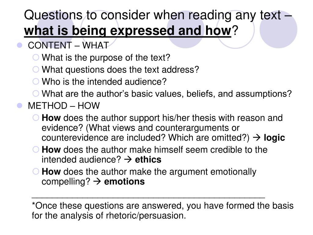 Questions to consider when reading any text – what is being expressed and how? • CONTENT – WHAT • What is the purpose of the text? • What questions does the text address? • Who is the intended audience? • What are the author’s basic values, beliefs, and assumptions? • METHOD – HOW • How does the author support his/her thesis with reason and evidence? (What views and counterarguments or counterevidence are included? Which are omitted?) logic • How does the author make himself seem credible to the intended audience? ethics • How does the author make the argument emotionally compelling? emotions ______________________________________________ *Once these questions are answered, you have formed the basis for the analysis of rhetoric/persuasion.