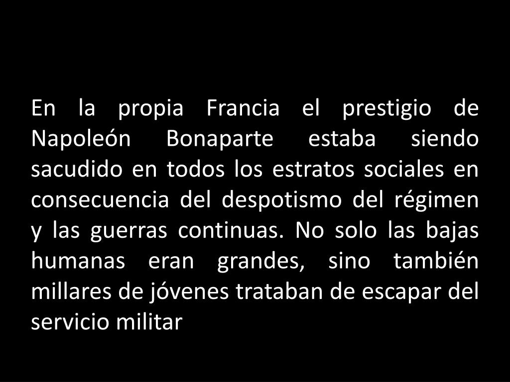 En la propia Francia el prestigio de Napoleón Bonaparte estaba siendo sacudido en todos los estratos sociales en consecuencia del despotismo del régimen y las guerras continuas. No solo las bajas humanas eran grandes, sino también millares de jóvenes trataban de escapar del servicio militar