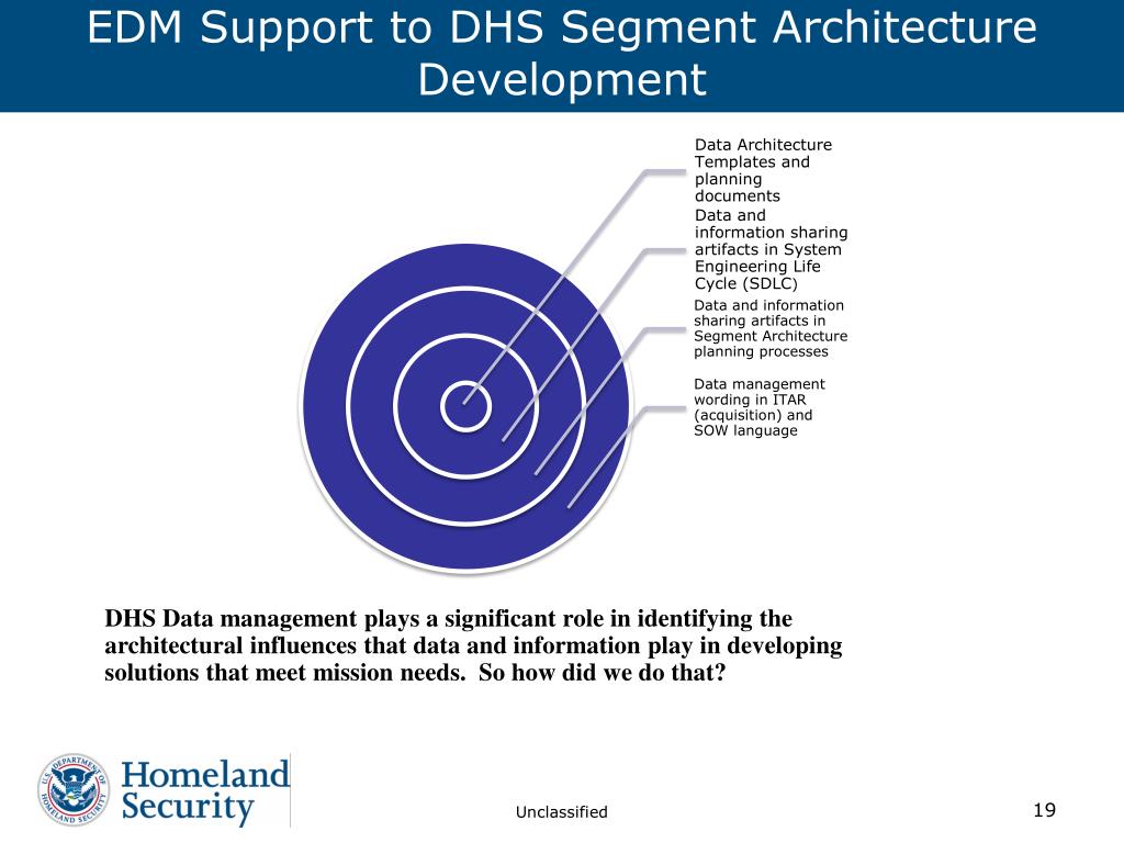 EDM Support to DHS Segment Architecture Development DHS Data management plays a significant role in identifying the architectural influences that data and information play in developing solutions that meet mission needs. So how did we do that? Unclassified
