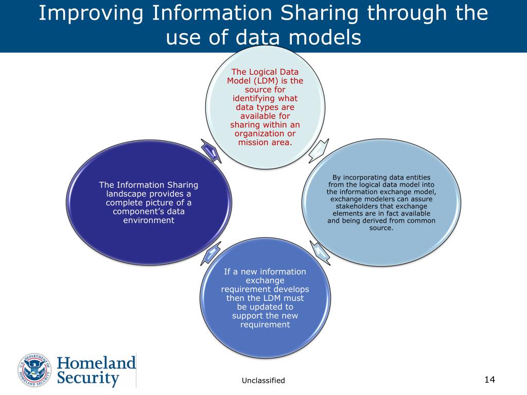 Support to DHS Enterprise Architecture Development • EDMO drives the information definition and management support required by Enterprise Architecture frameworks to meet mission needs • Identifying information sources, information exchanges, and data services for the information sharing environment • Driving data source and information exchange reuse for new investments by mandating inclusion in the EA Information Repository • Support to Investment Programs by reviewing their data architecture plans and providing feedback where appropriate and needed Unclassified