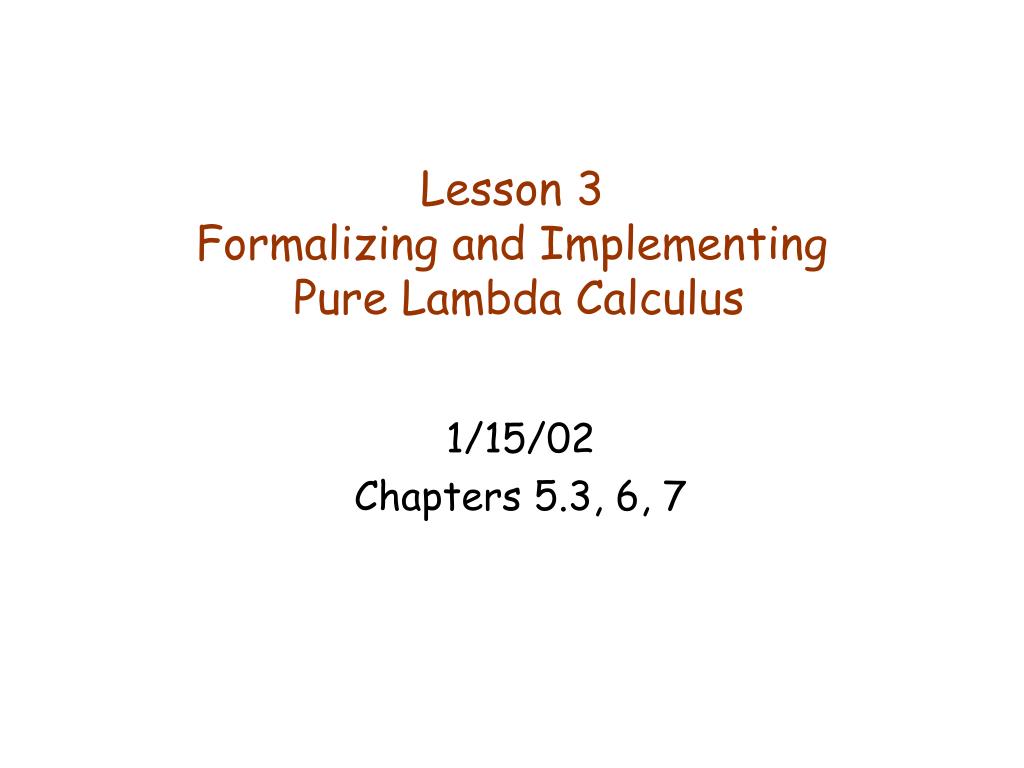 Lesson 3Formalizing and Implementing Pure Lambda Calculus 1/15/02 Chapters 5.3, 6, 7