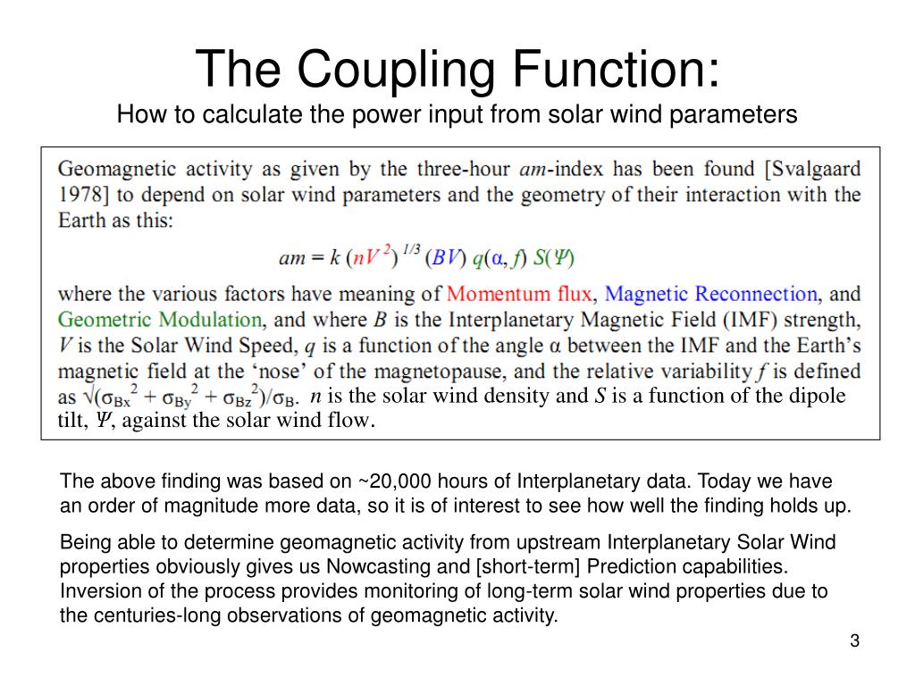 The Coupling Function: How to calculate the power input from solar wind parameters nis the solar wind density andS is a function of the dipole tilt, Ѱ, against the solar wind flow. The above finding was based on ~20,000 hours of Interplanetary data. Today we have an order of magnitude more data, so it is of interest to see how well the finding holds up. Being able to determine geomagnetic activity from upstream Interplanetary Solar Wind properties obviously gives us Nowcasting and [short-term] Prediction capabilities. Inversion of the process provides monitoring of long-term solar wind properties due to the centuries-long observations of geomagnetic activity.