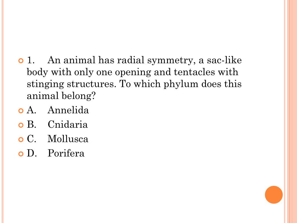 1. An animal has radial symmetry, a sac-like body with only one opening and tentacles with stinging structures. To which phylum does this animal belong? • A. Annelida • B. Cnidaria • C. Mollusca • D. Porifera