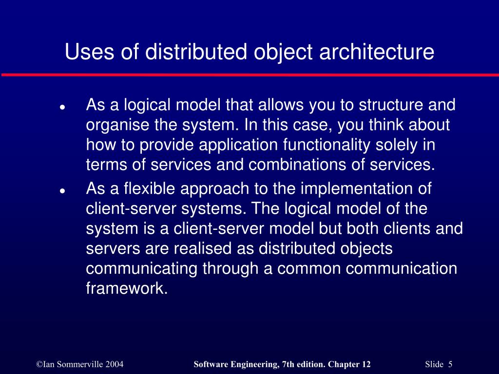 Uses of distributed object architecture • As a logical model that allows you to structure and organise the system. In this case, you think about how to provide application functionality solely in terms of services and combinations of services. • As a flexible approach to the implementation of client-server systems. The logical model of the system is a client-server model but both clients and servers are realised as distributed objects communicating through a common communication framework.