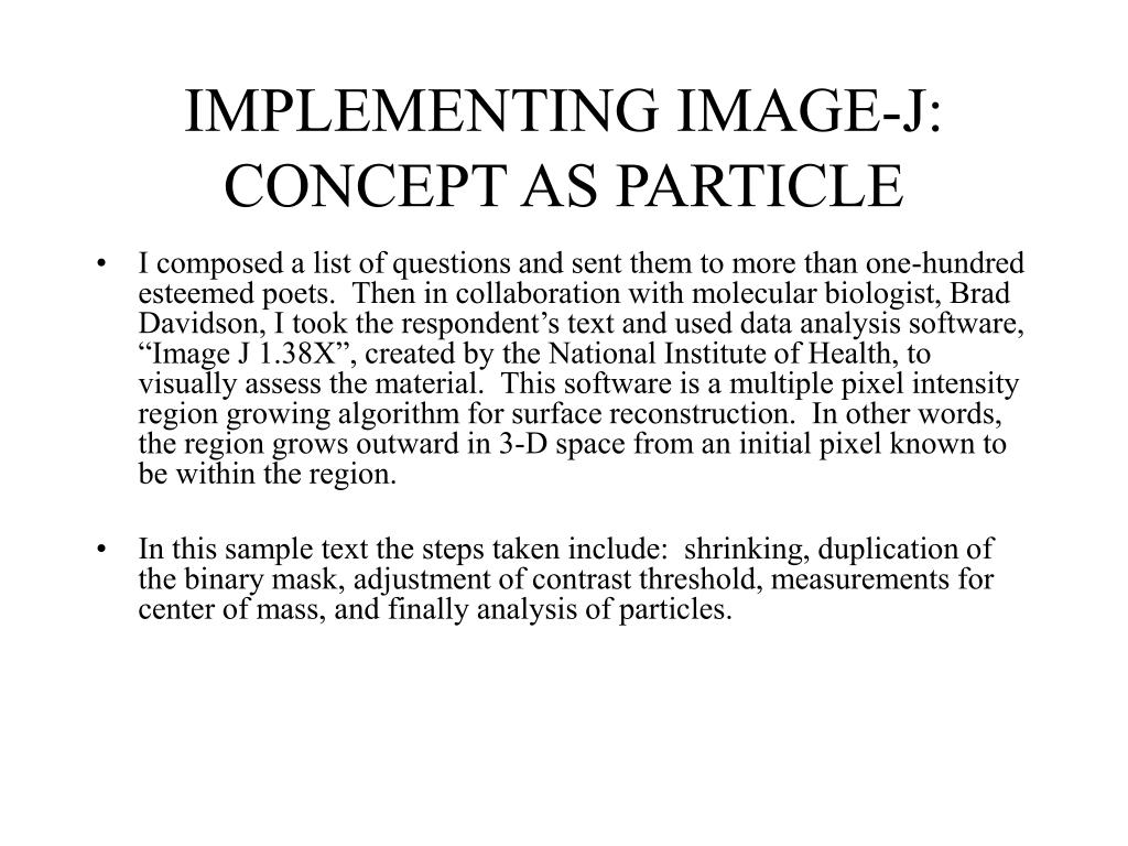 IMPLEMENTING IMAGE-J: CONCEPT AS PARTICLE • I composed a list of questions and sent them to more than one-hundred esteemed poets. Then in collaboration with molecular biologist, Brad Davidson, I took the respondent’s text and used data analysis software, “Image J 1.38X”, created by the National Institute of Health, to visually assess the material. This software is a multiple pixel intensity region growing algorithm for surface reconstruction. In other words, the region grows outward in 3-D space from an initial pixel known to be within the region. • In this sample text the steps taken include: shrinking, duplication of the binary mask, adjustment of contrast threshold, measurements for center of mass, and finally analysis of particles.
