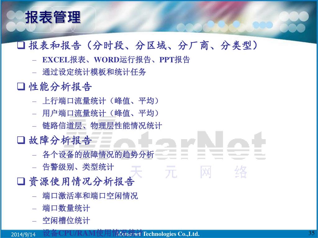 报表管理 • 报表和报告(分时段、分区域、分厂商、分类型) • EXCEL报表、WORD运行报告、PPT报告 • 通过设定统计模板和统计任务 • 性能分析报告 • 上行端口流量统计(峰值、平均) • 用户端口流量统计(峰值、平均) • 链路信道层、物理层性能情况统计 • 故障分析报告 • 各个设备的故障情况的趋势分析 • 告警级别、类型统计 • 资源使用情况分析报告 • 端口激活率和端口空闲情况 • 端口数量统计 • 空闲槽位统计 • 设备CPU/RAM使用情况统计 Metarnet Technologies Co.,Ltd.