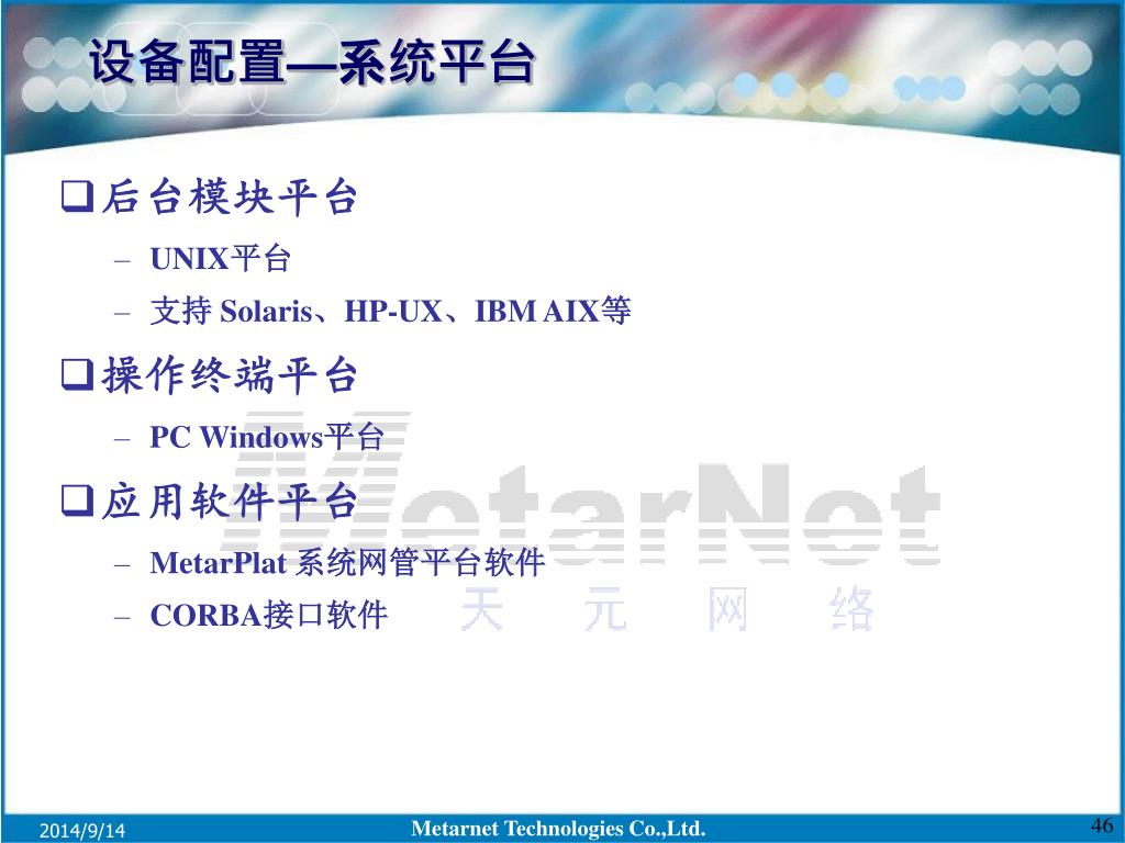 设备配置—系统平台 • 后台模块平台 • UNIX平台 • 支持 Solaris、HP-UX、IBM AIX等 • 操作终端平台 • PC Windows平台 • 应用软件平台 • MetarPlat 系统网管平台软件 • CORBA接口软件 Metarnet Technologies Co.,Ltd.