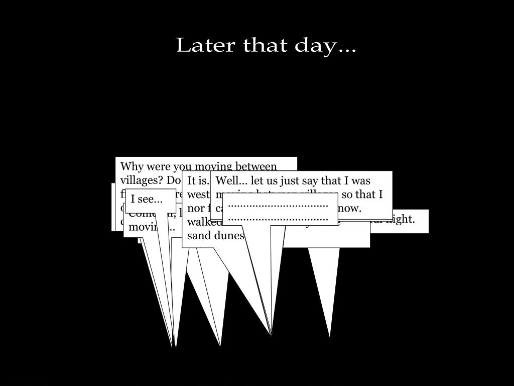 Later that day... Why were you moving between villages? Do you have family or friends there? I cannot see any other reason as to why they’d catch your interest. It is. I once came this far north-west. It was not long ago from now nor far away from here where I walked across those very same sand dunes. Well… let us just say that I was moving between villages so that I can be where I am right now. I did want to, but it was not what I set out to do, I was moving between villages you see. Did you not go into the city? It is famous for its sights and grandeur. I shouldn’t think so. I see… …………………………………………………………………………………………………………………… ………………………………………………………… Well there it is… the City of Lathon… Come on, let’s get moving… It’s getting late, do you think they close their gates when a certain hour passes? It’s such a beautiful night.