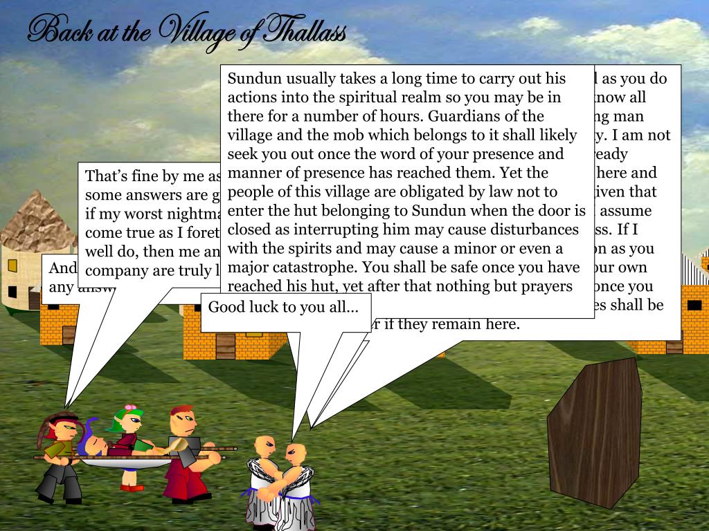 Shaman Back at the Village of Thallass Sundun usually takes a long time to carry out his actions into the spiritual realm so you may be in there for a number of hours. Guardians of the village and the mob which belongs to it shall likely seek you out once the word of your presence and manner of presence has reached them. Yet the people of this village are obligated by law not to enter the hut belonging to Sundun when the door is closed as interrupting him may cause disturbances with the spirits and may cause a minor or even a major catastrophe. You shall be safe once you have reached his hut, yet after that nothing but prayers can save you. I do not know the whole situation as well as you do so that is for you to decide. But for all I know all four of you may have murdered this young man and then claimed that he fell from the sky. I am not accusing you of anything but we have already caught many suspicious eyes on the way here and people may very well assume the worst given that you are strangers to this place and thus I assume are under oath to be humble and harmless. If I were you I would leave this village as soon as you have spoken to Sundun for the sake of your own safety. Do with the body what you must once you have left. Yet leave you must for your lives shall be in danger if they remain here. That’s fine by me as long as some answers are given. And if my worst nightmare is to come true as I foretell it may well do, then me and my company are truly lost. There it is, the hut where the man they call Sundun lives. Of all the people for hundreds of miles around he is most in contact with the spirits. Any answers that you may need shall be given by him. And what if he doesn’t have any answers? Good luck to you all…