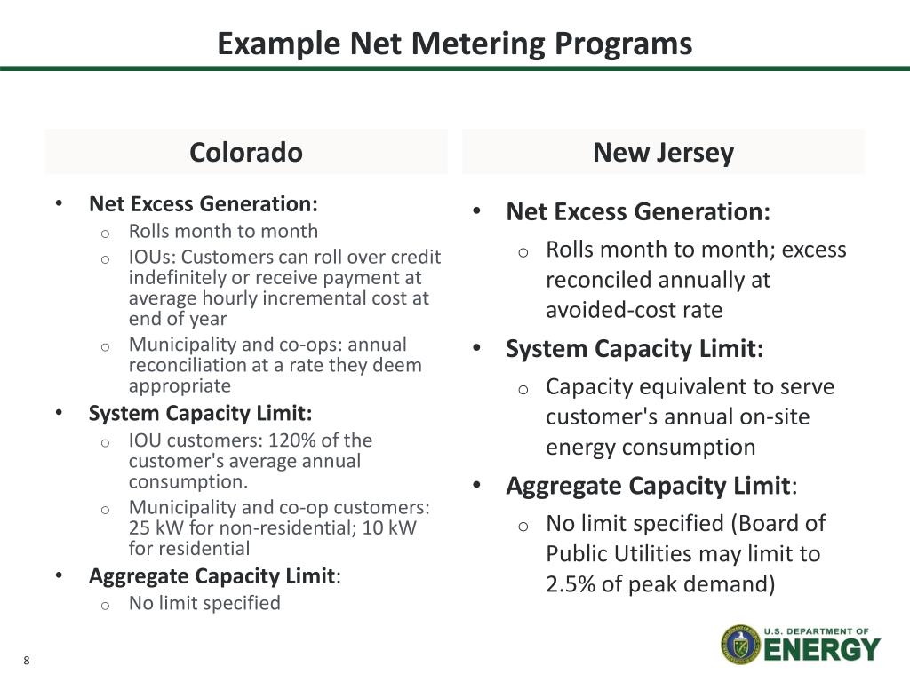 Example Net Metering Programs Colorado New Jersey • Net Excess Generation: • Rolls month to month • IOUs: Customers can roll over credit indefinitely or receive payment at average hourly incremental cost at end of year • Municipality and co-ops: annual reconciliation at a rate they deem appropriate • System Capacity Limit: • IOU customers: 120% of the customer's average annual consumption. • Municipality and co-op customers: 25 kW for non-residential; 10 kW for residential • Aggregate Capacity Limit: • No limit specified • Net Excess Generation: • Rolls month to month; excess reconciled annually at avoided-cost rate • System Capacity Limit: • Capacity equivalent to serve customer's annual on-site energy consumption • Aggregate Capacity Limit: • No limit specified (Board of Public Utilities may limit to 2.5% of peak demand)