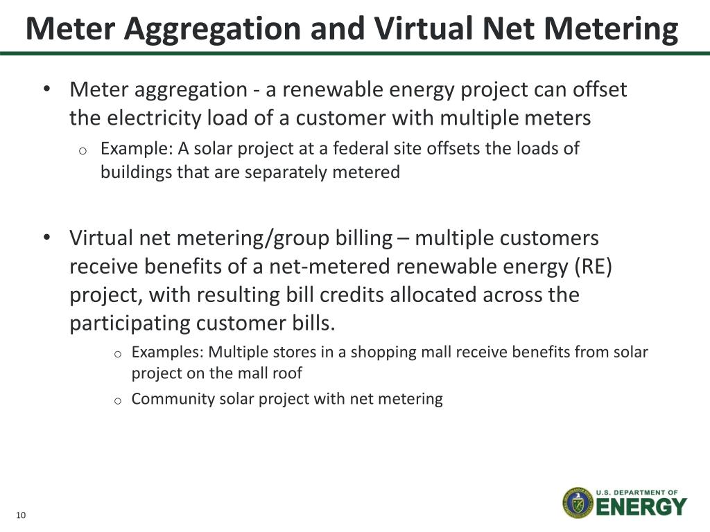 Meter Aggregation and Virtual Net Metering Meter aggregation - a renewable energy project can offset the electricity load of a customer with multiple meters • Example: A solar project at a federal site offsets the loads of buildings that are separately metered Virtual net metering/group billing – multiple customers receive benefits of a net-metered renewable energy (RE) project, with resulting bill credits allocated across the participating customer bills. • Examples: Multiple stores in a shopping mall receive benefits from solar project on the mall roof • Community solar project with net metering