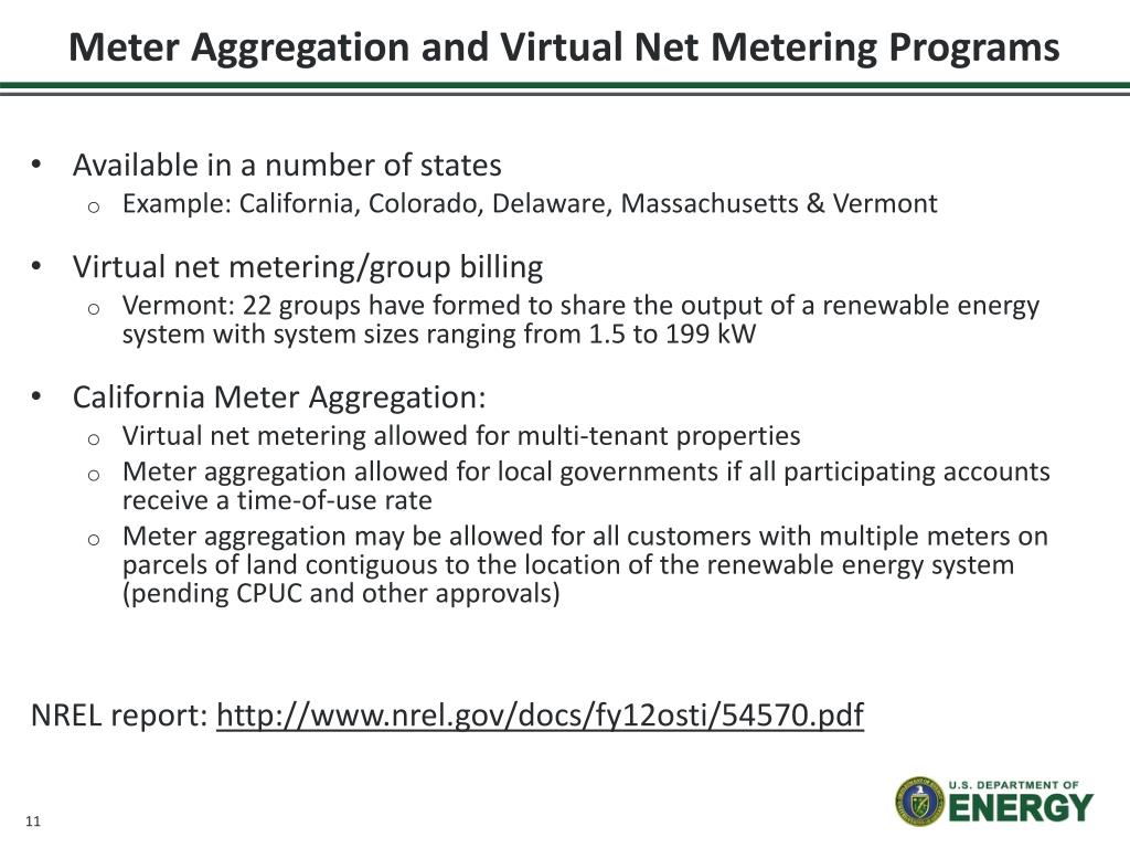Meter Aggregation and Virtual Net Metering Programs • Available in a number of states • Example: California, Colorado, Delaware, Massachusetts & Vermont • Virtual net metering/group billing • Vermont: 22 groups have formed to share the output of a renewable energy system with system sizes ranging from 1.5 to 199 kW • California Meter Aggregation: • Virtual net metering allowed for multi-tenant properties • Meter aggregation allowed for local governments if all participating accounts receive a time-of-use rate • Meter aggregation may be allowed for all customers with multiple meters on parcels of land contiguous to the location of the renewable energy system (pending CPUC and other approvals) NREL report: http://www.nrel.gov/docs/fy12osti/54570.pdf