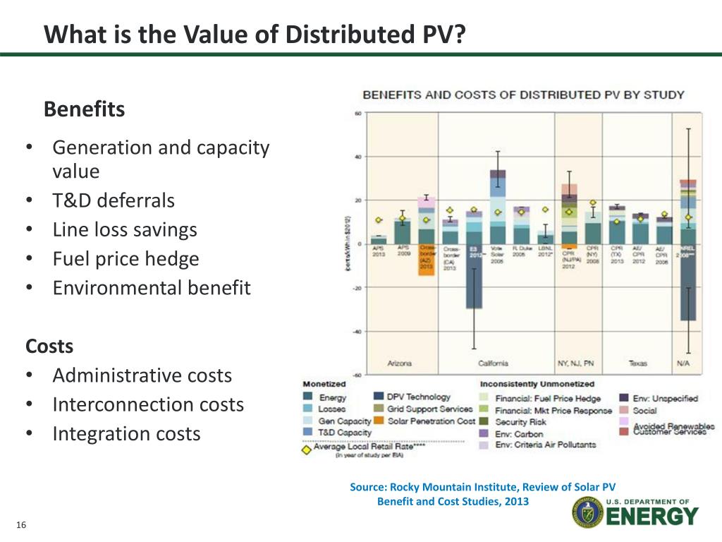 What is the Value of Distributed PV? Benefits Source: Rocky Mountain Institute, Review of Solar PV Benefit and Cost Studies, 2013 • Generation and capacity value • T&D deferrals • Line loss savings • Fuel price hedge • Environmental benefit Costs • Administrative costs • Interconnection costs • Integration costs