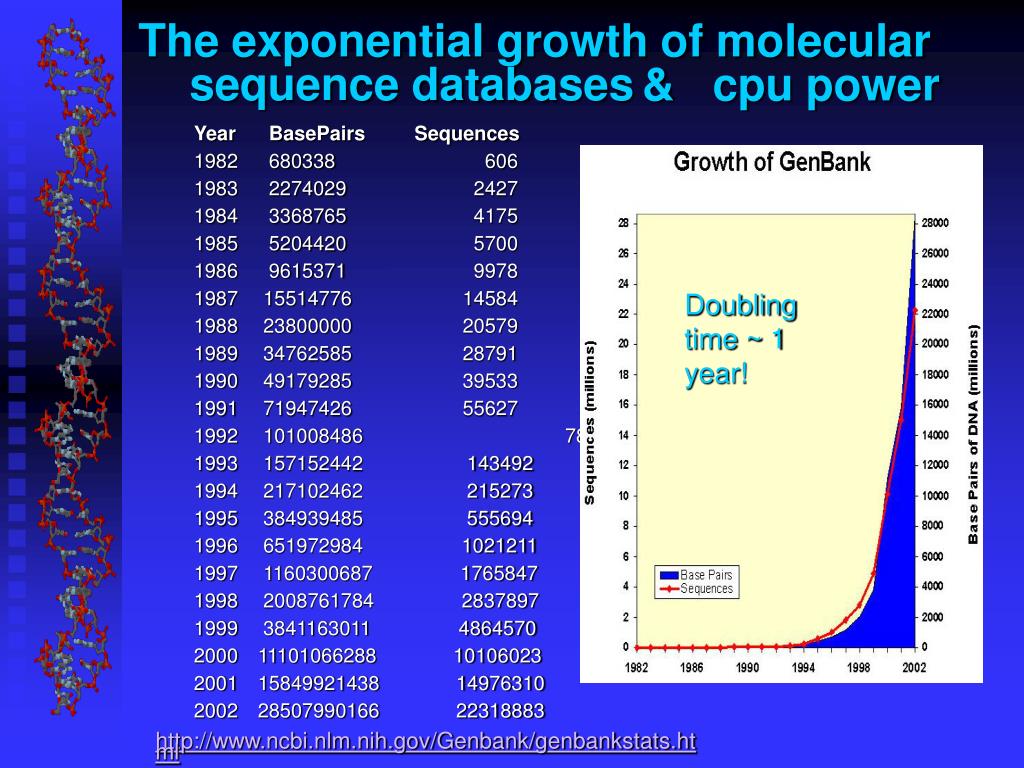 & cpu power The exponential growth of molecular sequence databases Year BasePairs Sequences 1982 680338 606 1983 2274029 2427 1984 3368765 4175 1985 5204420 5700 1986 9615371 9978 1987 15514776 14584 1988 23800000 20579 1989 34762585 28791 1990 49179285 39533 1991 71947426 55627 1992 101008486 78608 1993 157152442 143492 1994 217102462 215273 1995 384939485 555694 1996 651972984 1021211 1997 1160300687 1765847 1998 2008761784 2837897 1999 3841163011 4864570 2000 11101066288 10106023 2001 15849921438 14976310 2002 28507990166 22318883 http://www.ncbi.nlm.nih.gov/Genbank/genbankstats.html Doubling time ~ 1 year!