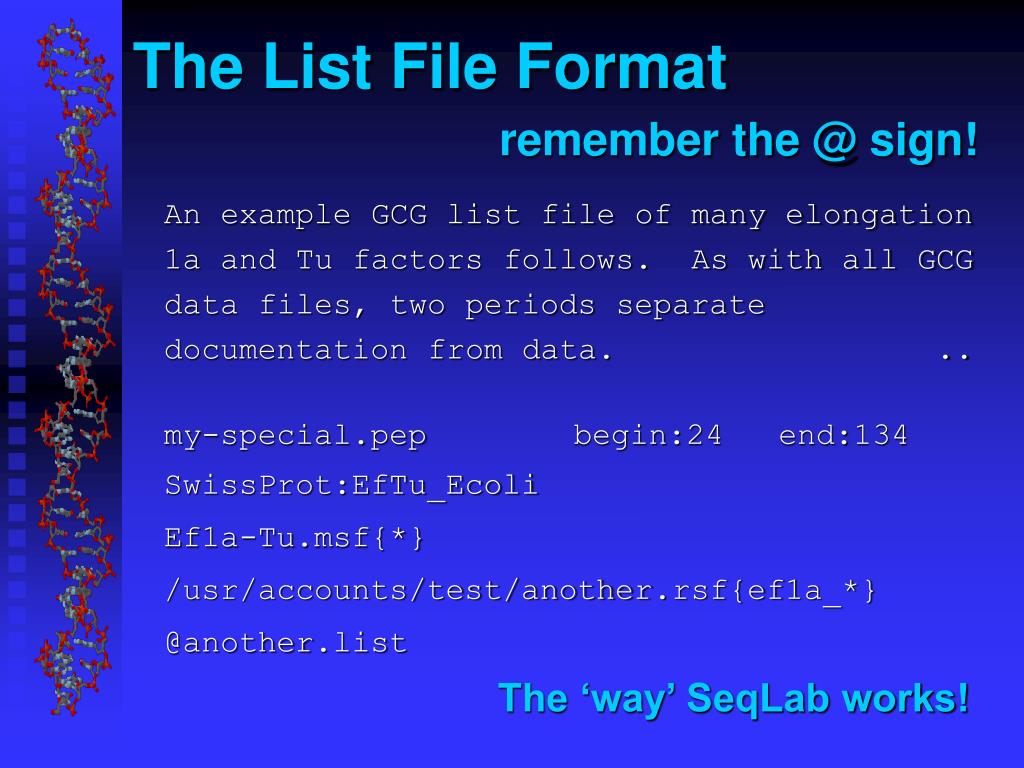 The List File Format remember the @ sign! • An example GCG list file of many elongation 1a and Tu factors follows. As with all GCG data files, two periods separate documentation from data. .. • my-special.pep begin:24 end:134 • SwissProt:EfTu_Ecoli • Ef1a-Tu.msf{*} • /usr/accounts/test/another.rsf{ef1a_*} • @another.list The ‘way’ SeqLab works!