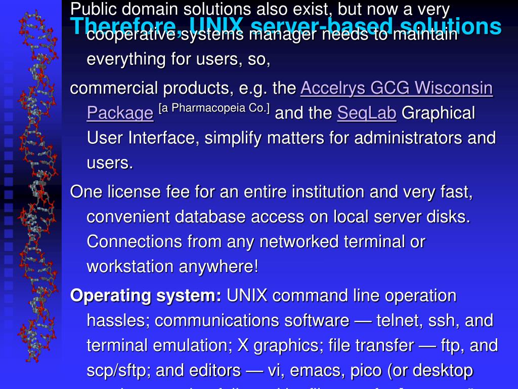 Therefore, UNIX server-based solutions • Public domain solutions also exist, but now a very cooperative systems manager needs to maintain everything for users, so, • commercial products, e.g. the Accelrys GCG Wisconsin Package[a Pharmacopeia Co.] and the SeqLab Graphical User Interface, simplify matters for administrators and users. • One license fee for an entire institution and very fast, convenient database access on local server disks. Connections from any networked terminal or workstation anywhere! • Operating system: UNIX command line operation hassles; communications software — telnet, ssh, and terminal emulation; X graphics; file transfer — ftp, and scp/sftp; and editors — vi, emacs, pico (or desktop word processing followed by file transfer [save as "text only!"]).