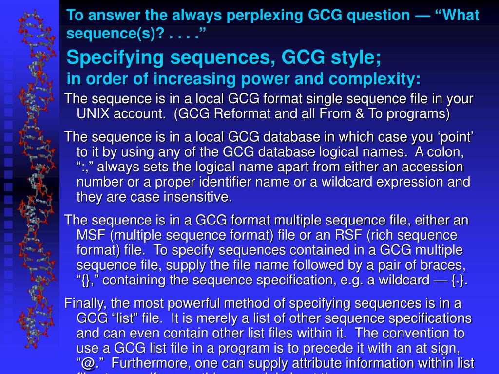 To answer the always perplexing GCG question —“What sequence(s)? . . . .” Specifying sequences, GCG style; in order of increasing power and complexity: • The sequence is in a local GCG format single sequence file in your UNIX account. (GCG Reformat and all From & To programs) • The sequence is in a local GCG database in which case you ‘point’ to it by using any of the GCG database logical names. A colon, “:,” always sets the logical name apart from either an accession number or a proper identifier name or a wildcard expression and they are case insensitive. • The sequence is in a GCG format multiple sequence file, either an MSF (multiple sequence format) file or an RSF (rich sequence format) file. To specify sequences contained in a GCG multiple sequence file, supply the file name followed by a pair of braces, “{},” containing the sequence specification, e.g. a wildcard — {*}. • Finally, the most powerful method of specifying sequences is in a GCG “list” file. It is merely a list of other sequence specifications and can even contain other list files within it. The convention to use a GCG list file in a program is to precede it with an at sign, “@.” Furthermore, one can supply attribute information within list files to specify something special about the sequence.
