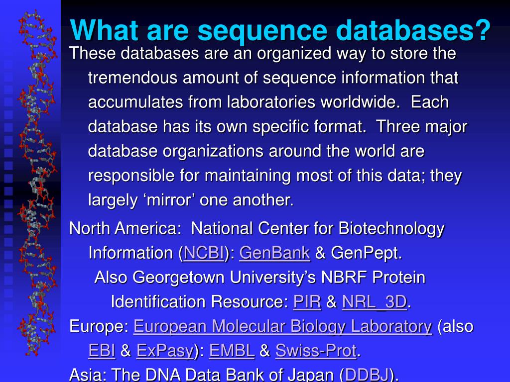 What are sequence databases? • These databases are an organized way to store the tremendous amount of sequence information that accumulates from laboratories worldwide. Each database has its own specific format. Three major database organizations around the world are responsible for maintaining most of this data; they largely ‘mirror’ one another. • North America: National Center for Biotechnology Information (NCBI): GenBank & GenPept. • Also Georgetown University’s NBRF Protein Identification Resource: PIR & NRL_3D. • Europe: European Molecular Biology Laboratory (also EBI & ExPasy): EMBL & Swiss-Prot. • Asia: The DNA Data Bank of Japan (DDBJ).