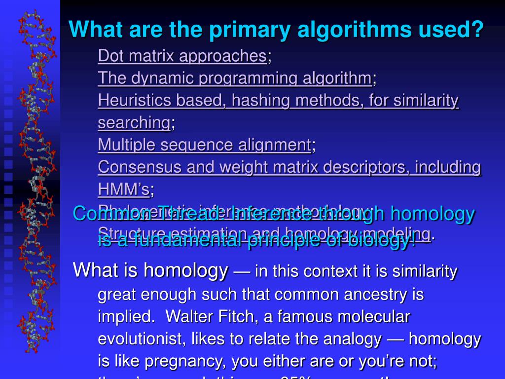 What are the primary algorithms used? Dot matrix approaches; The dynamic programming algorithm; Heuristics based, hashing methods, for similarity searching; Multiple sequence alignment; Consensus and weight matrix descriptors, including HMM’s; Phylogenetic inference methodology; Structure estimation and homology modeling. Common Thread: Inference through homology is a fundamental principle of biology! What is homology — in this context it is similarity great enough such that common ancestry is implied. Walter Fitch, a famous molecular evolutionist, likes to relate the analogy — homology is like pregnancy, you either are or you’re not; there’s no such thing as 65% pregnant!