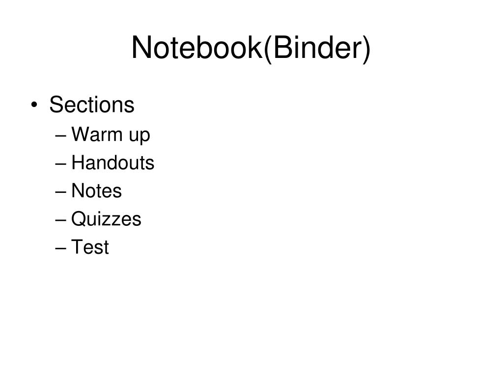 Notebook(Binder) • Sections • Warm up • Handouts • Notes • Quizzes • Test