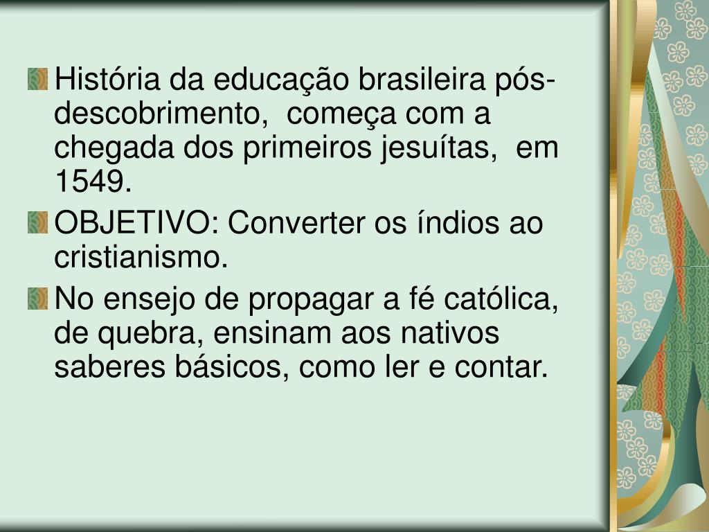 História da educação brasileira pós-descobrimento, começa com a chegada dos primeiros jesuítas, em 1549. • OBJETIVO: Converter os índios ao cristianismo. • No ensejo de propagar a fé católica, de quebra, ensinam aos nativos saberes básicos, como ler e contar.
