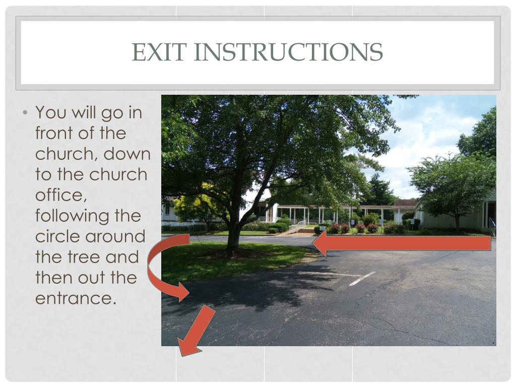 Exit instructions • You will go in front of the church, down to the church office, following the circle around the tree and then out the entrance.
