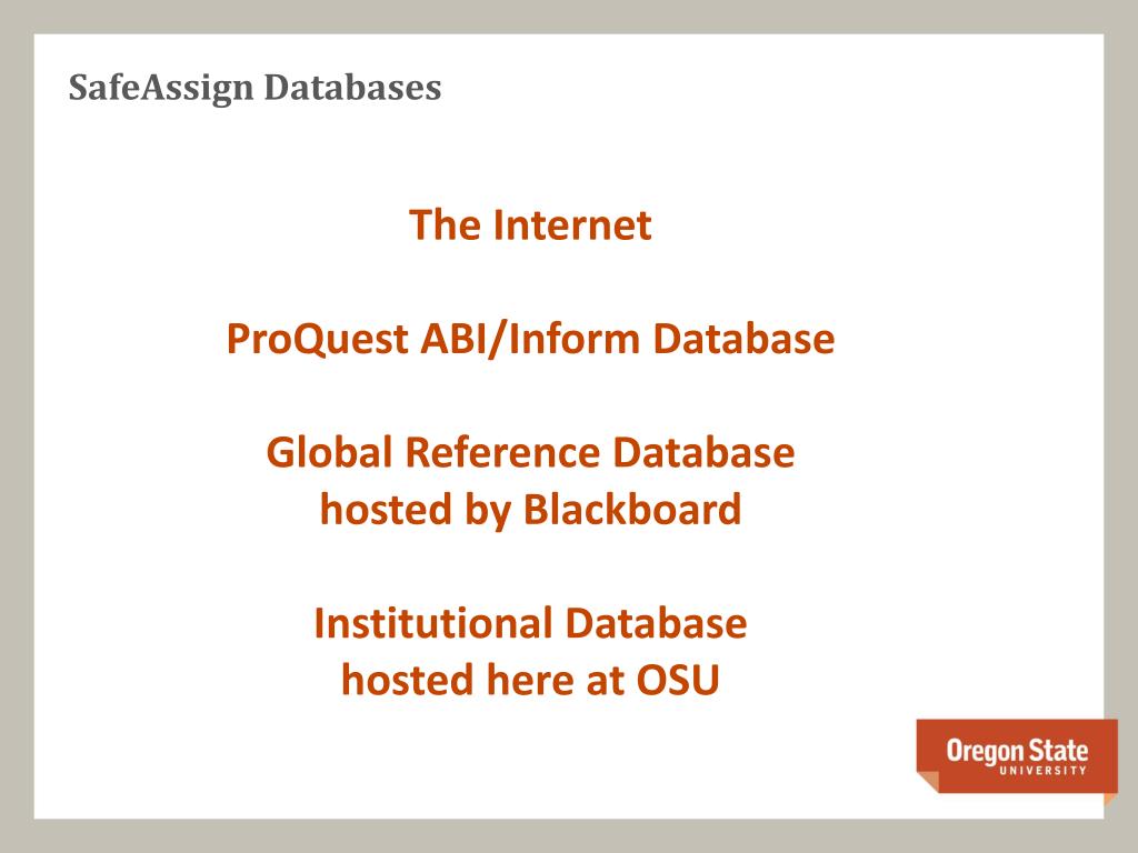 SafeAssign Databases The Internet ProQuest ABI/Inform Database Global Reference Databasehosted by Blackboard Institutional Databasehosted here at OSU