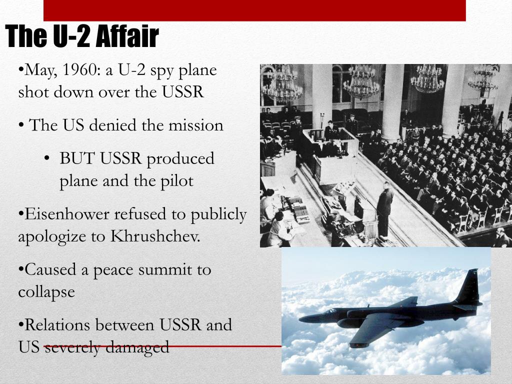 The U-2 Affair • May, 1960: a U-2 spy plane shot down over the USSR • The US denied the mission • BUT USSR produced plane and the pilot • Eisenhower refused to publicly apologize to Khrushchev. • Caused a peace summit to collapse • Relations between USSR and US severely damaged