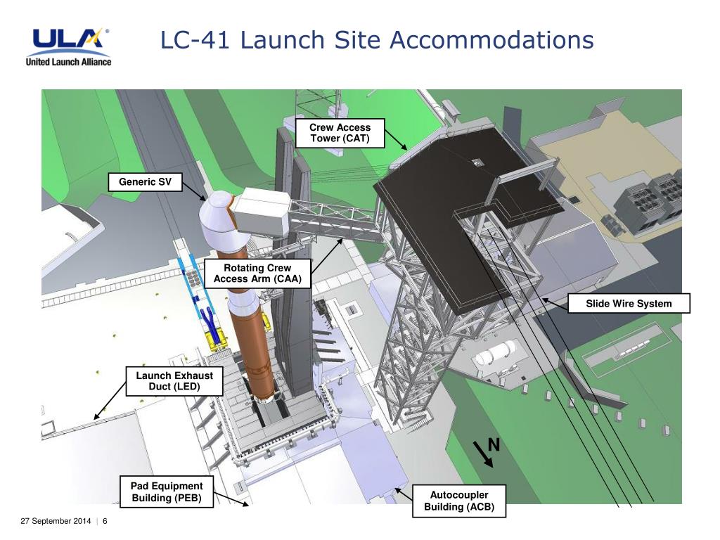 LC-41 Launch Site Accommodations Crew Access Tower (CAT) Generic SV Rotating Crew Access Arm (CAA) Slide Wire System Launch Exhaust Duct (LED) N Pad Equipment Building (PEB) Autocoupler Building (ACB)