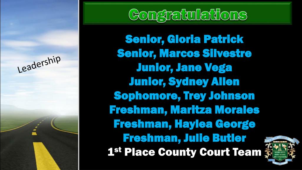Congratulations Senior, Gloria Patrick Senior, Marcos Silvestre Junior, Jane Vega Junior, Sydney Allen Sophomore, Trey Johnson Freshman, Maritza Morales Freshman, Haylea George Freshman, Julie Butler 1st Place County Court Team Leadership
