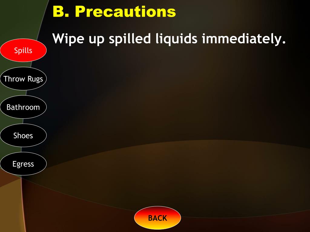 B. Precautions Wipe up spilled liquids immediately. Spills Throw Rugs Bathroom Shoes Egress BACK