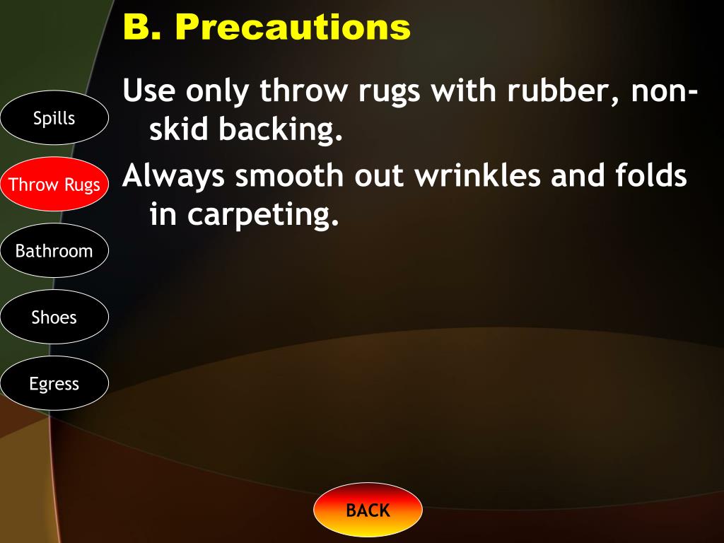 B. Precautions Use only throw rugs with rubber, non-skid backing. Always smooth out wrinkles and folds in carpeting. Spills Throw Rugs Bathroom Shoes Egress BACK