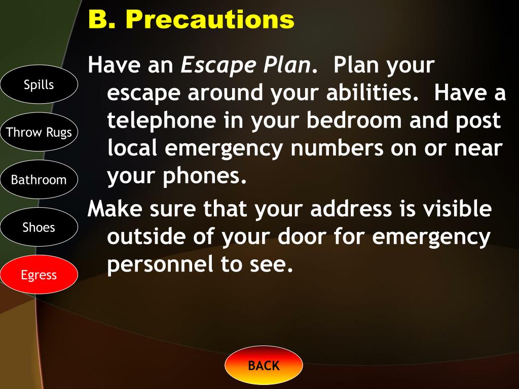 B. Precautions Have an Escape Plan. Plan your escape around your abilities. Have a telephone in your bedroom and post local emergency numbers on or near your phones. Make sure that your address is visible outside of your door for emergency personnel to see. Spills Throw Rugs Bathroom Shoes Egress BACK