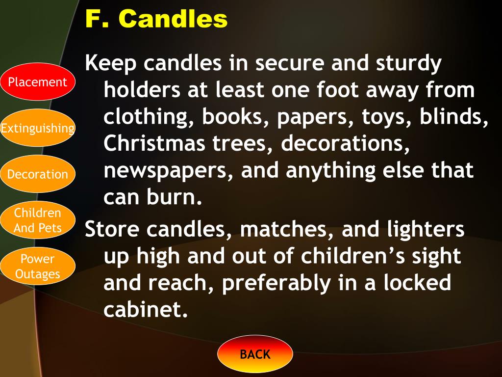 F. Candles Keep candles in secure and sturdy holders at least one foot away from clothing, books, papers, toys, blinds, Christmas trees, decorations, newspapers, and anything else that can burn. Store candles, matches, and lighters up high and out of children’s sight and reach, preferably in a locked cabinet. Placement Extinguishing Decoration Children And Pets Power Outages BACK