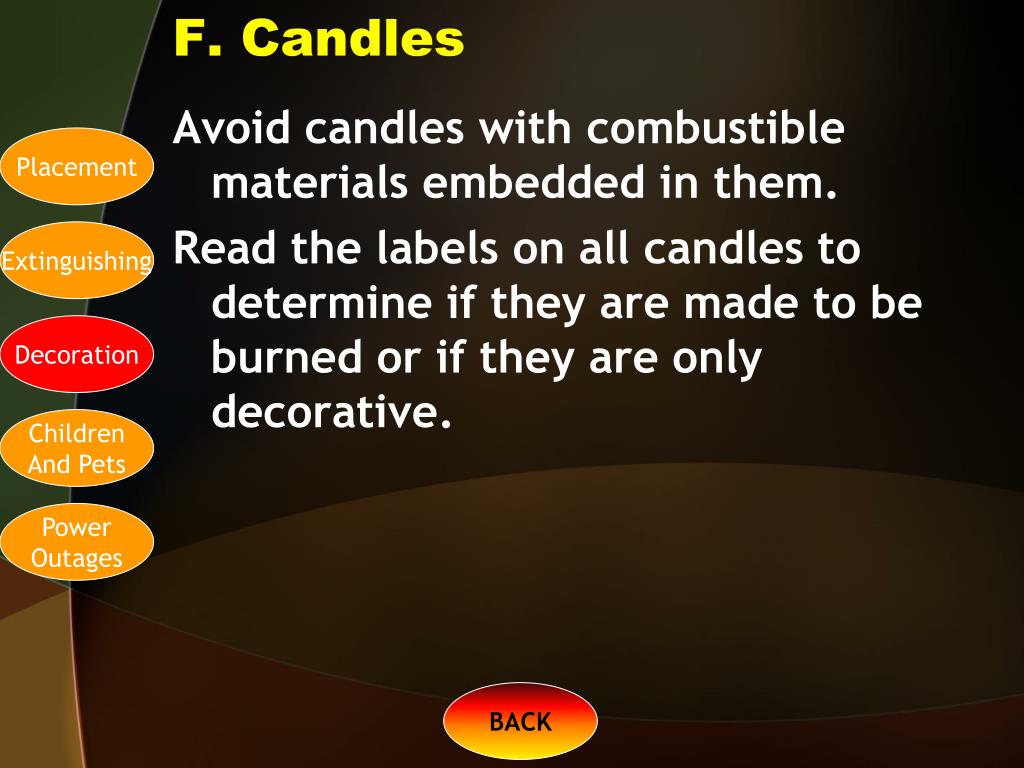 F. Candles Avoid candles with combustible materials embedded in them. Read the labels on all candles to determine if they are made to be burned or if they are only decorative. Placement Extinguishing Decoration Children And Pets Power Outages BACK