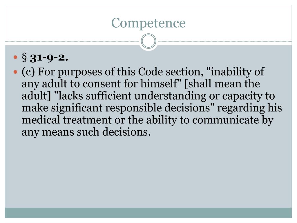 Competence • § 31-9-2. • (c) For purposes of this Code section, "inability of any adult to consent for himself" [shall mean the adult] "lacks sufficient understanding or capacity to make significant responsible decisions" regarding his medical treatment or the ability to communicate by any means such decisions.